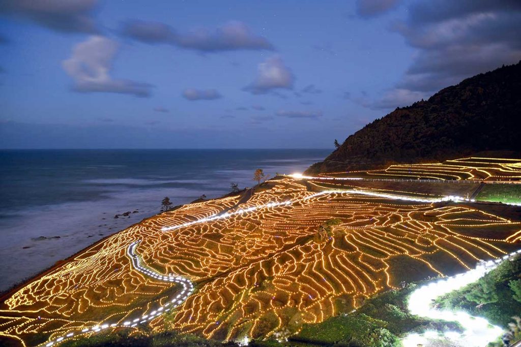 輪島市に広がる白米千枚田は日本の棚田百選、国指定文化財名勝に指定されている名所です。冬は25,000個のLEDが彩る壮大なイルミネーション「あぜのきらめき」を開催しています(2023年3月12日まで)。