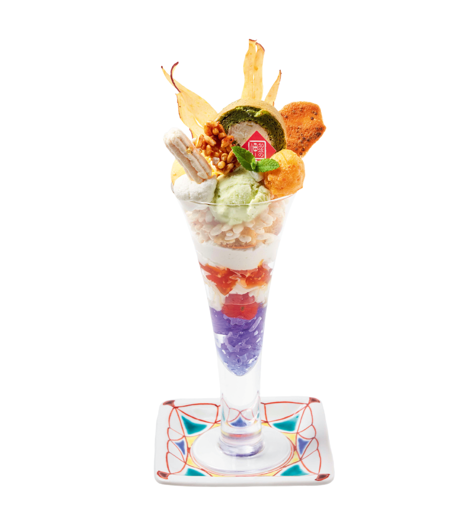 加賀九谷野菜や温泉卵という地元食材をふんだんにトッピングした、こだわりの5層パフェ。九谷焼と山中漆器で提供される、メイドイン加賀のご当地名物パフェはインパクト抜群です!