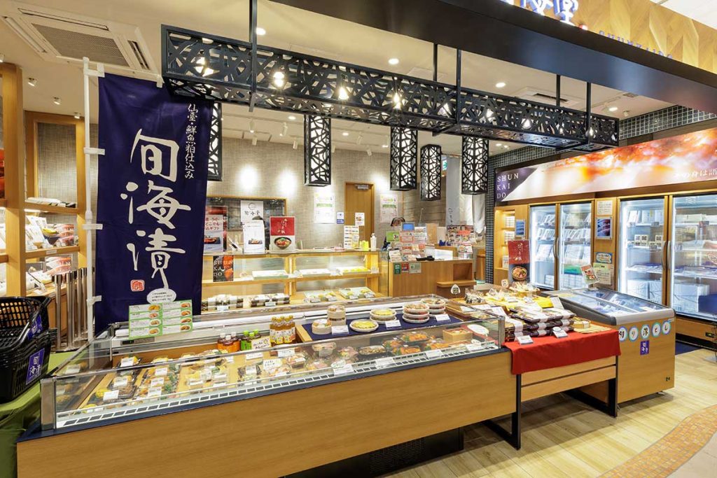 旬海漬のほか、惣菜や弁当を販売する仙台駅店(仙台駅1F)。奥のレストランスペースでは料理人謹製の丼や定食が楽しめます