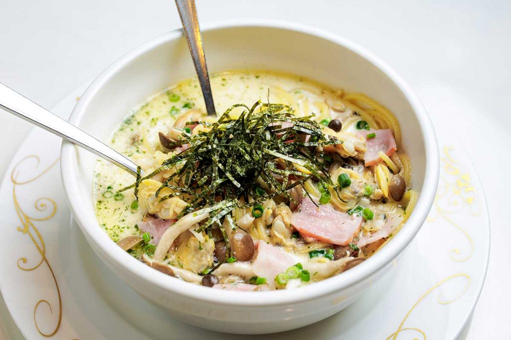 地元民も通う“スープスパの店”『パスタハウストライアングル』。37年前の創業当時からの看板メニューが「特製スープスパゲティ」です。器の中には、濃厚でクリーミーなスープがたっぷり。ベーコンやアサリ、しめじの旨みを生クリームとチーズで凝縮させたクラムチャウダーのような味わいです。海苔とあさつきがアクセントになり、スープを飲み干してしまうほどクセになるおいしさです。