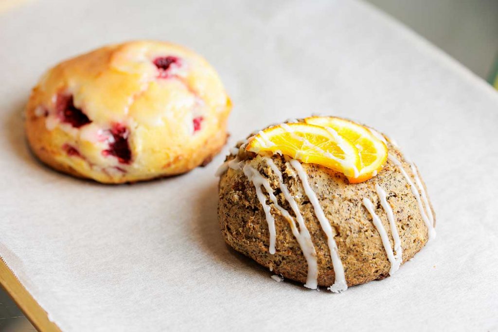 クリームチーズをたっぷり入れた生地にフルーツを混ぜ込んだハワイアンスコーン。「アールグレイ&オレンジ クリームチーズ」(手前)と「フランボワーズ クリームチーズ」(奥)(各399円)