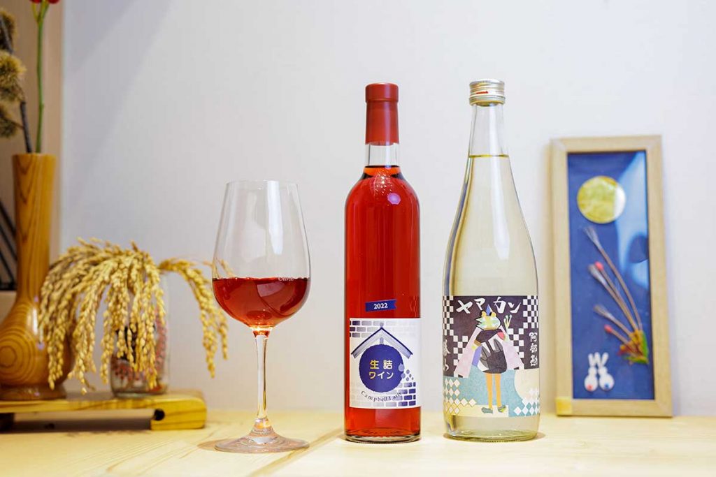 県内の酒蔵やワイナリーとタッグを組んで開発した『むとう屋』オリジナルアイテムも人気。宝石のような色合いが美しい「生詰ワイン」(左・1,650円)と「ヤマカン2022」(右・2,970円)