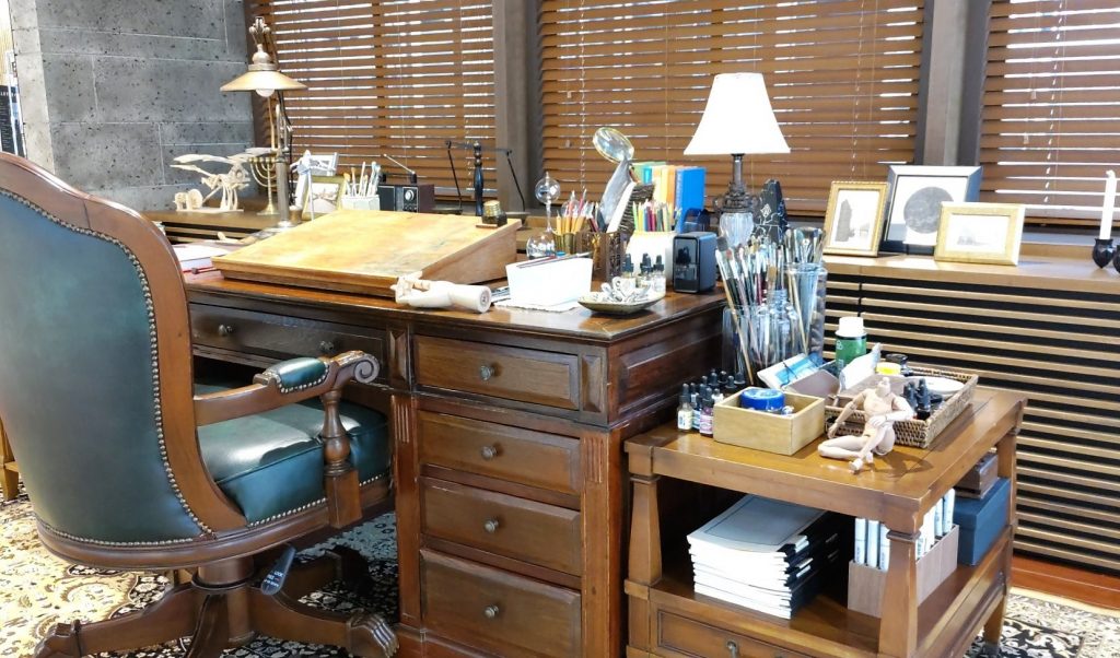 木製のトレス台、窓際の燭台やオブジェもドラマで使用したものだそう