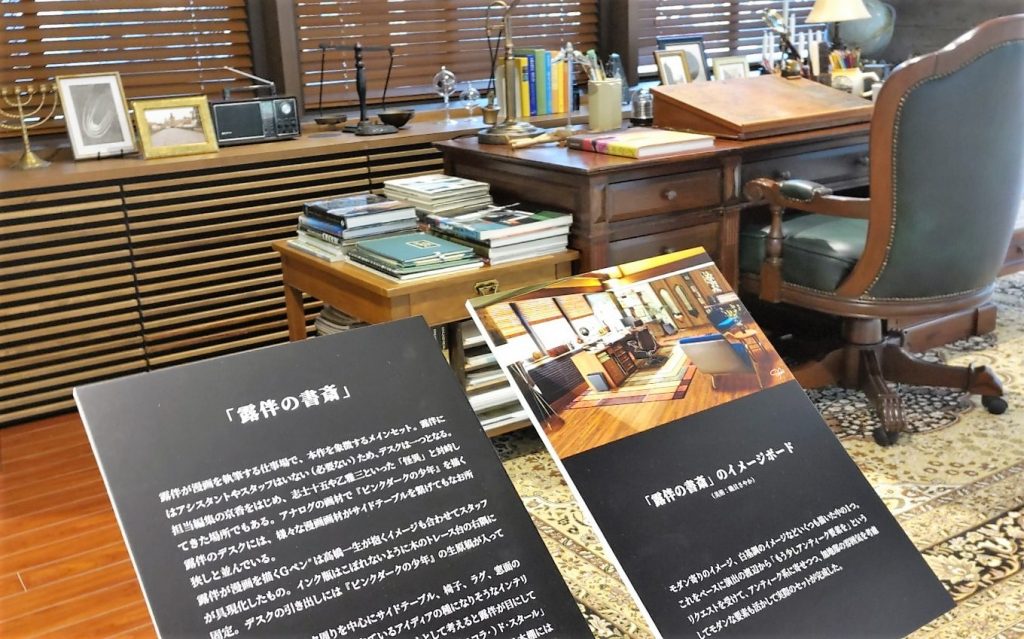 今回の展覧会の紹介パネル。主人不在の書斎が想像力を掻き立てます