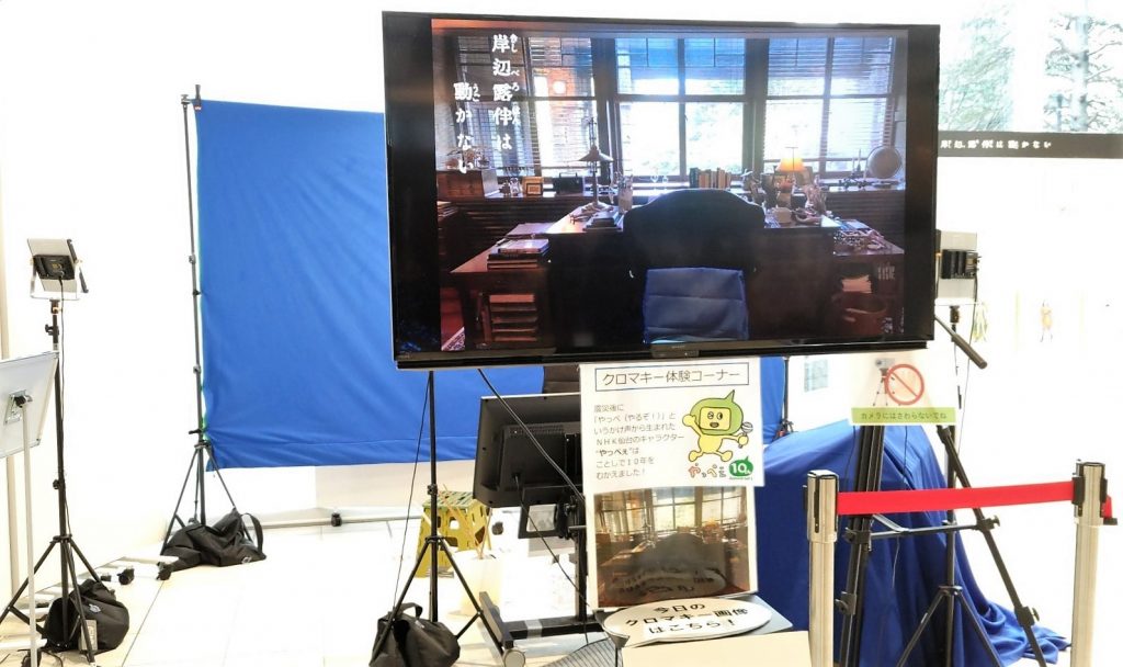 写真では伝えづらいのですが、ブルーバックのスペースでポーズを取ると「露伴先生の書斎にいる自分」がモニターに映るんですよ。