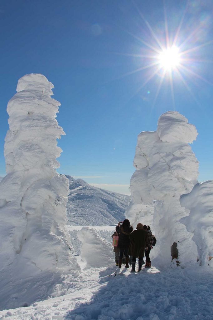 山頂付近で木々(アオモリトドマツ)に雪が吹き付けてできる「樹氷」は、別名スノーモンスターとも呼ばれます。