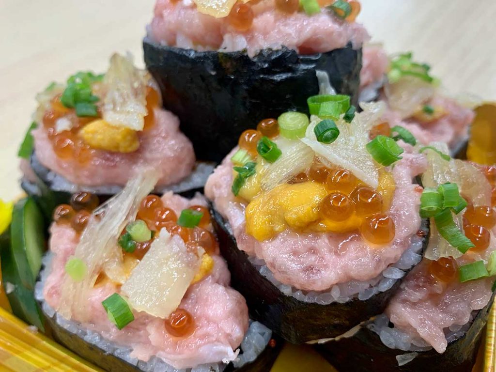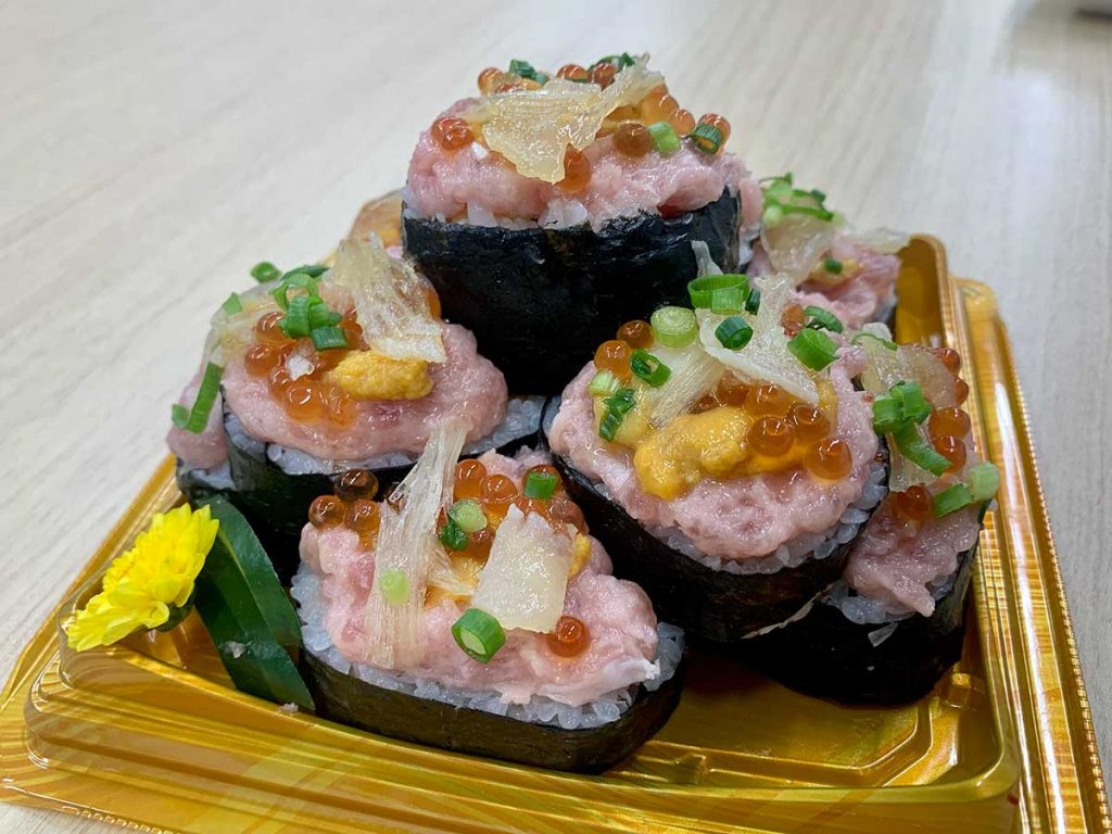 3段ピラミッドに積み重なった巻き寿司の上には、こぼれんばかりのネギトロとイクラ、そしてウニ。さらに頂上では、フカヒレが優雅に舞い踊ります。