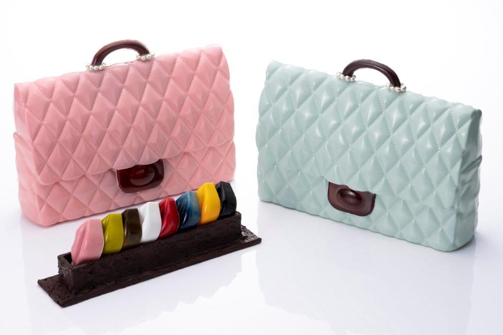 すべてチョコレートで創作されたハンドバッグ型の逸品です。バッグの中には、唇の形をあしらったカラフルなボンボンショコラ「レーブル コロレ」8種を詰め合わせています。