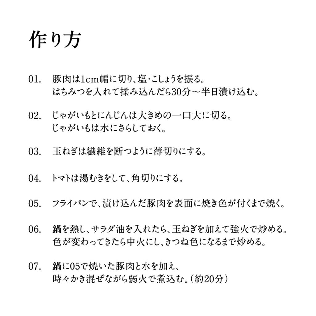 ちょうどいい煮込み具合でとろける具材にハチミツ由来のまろやかさ、ほのかに感じるトマトの酸味。思わずご飯がすすむそのホッとする味わいは、まさに「おうちカレー」の決定版。ぜひレシピを見て、誰からも愛されるカレーの味を実際に作って堪能してみてください!