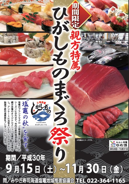 「三陸塩竈ひがしもの」とは、9月~12月にかけて『塩釜市魚市場』に水揚げされるメバチマグロのうち、塩釜にいる日本一の目利き人(仲買人)の目によって厳しい条件をクリアした、「鮮度」「色つや」「脂のり」「旨み」に優れているメバチマグロの事を言います。その希少性はなんと100本に1本! 一般では滅多に味わうことができない、季節限定の上質で新鮮なブランドマグロなんです。そんな、塩竈のブランドマグロ「三陸塩竈ひがしもの」のシーズン到来に合わせて、市内の寿司海道加盟12店舗でイベントを開催中。各店の親方自慢のオリジナルメニューを提供しています。食事をして、アンケートに答えた人の中から、抽選で寿司食事券をプレゼント! 皆さん秋のおでかけは塩竈へレッツゴー。