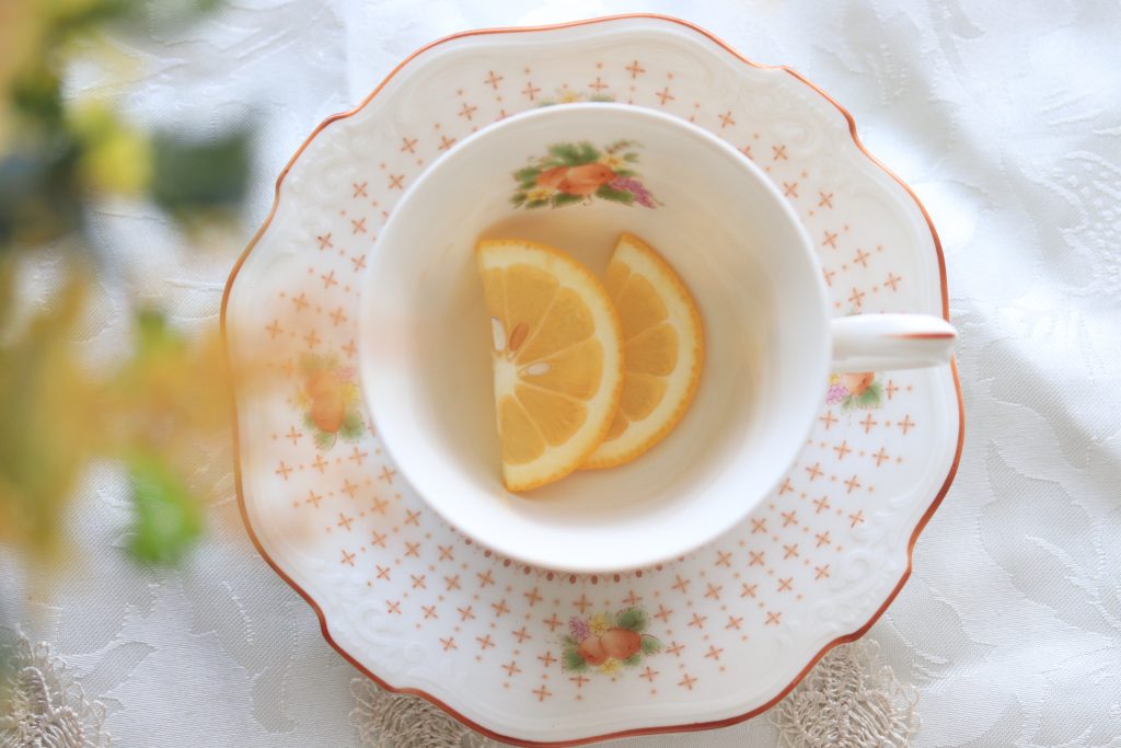 ①ティーカップにスライスしたレモンを入れる
