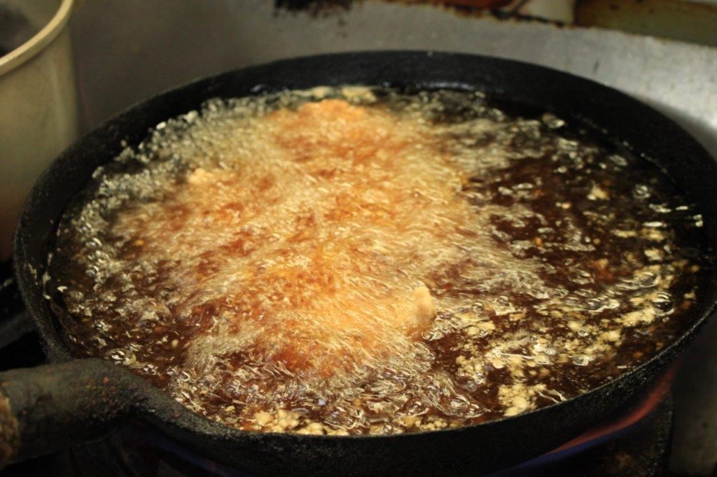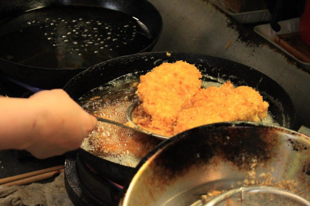 手のひらよりも大きいサイズのカツをパチパチ揚げていきます