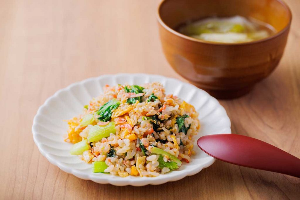 歯触りの良い小エビと小松菜を具材に、和風のうどんスープで炒めた玄米チャーハン