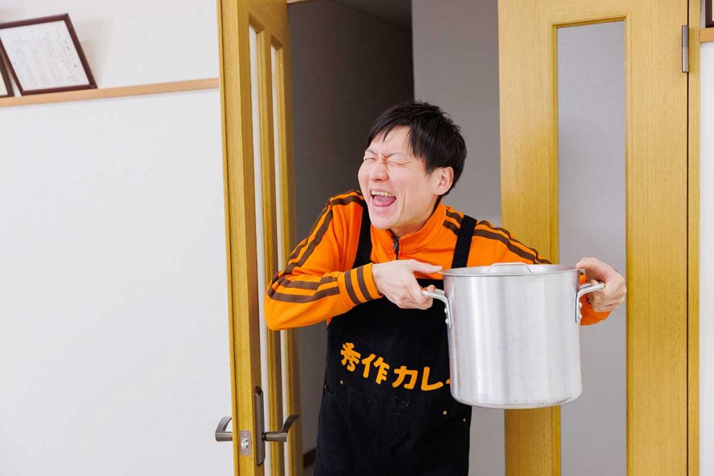なーんてまとめようとしていたら、あれ?秀作さんが寸胴を持って登場。「すいませぇ~ん!」(秀作)。さっきまではなかったエプロンには「秀作カレー」の文字が。まさか⁉