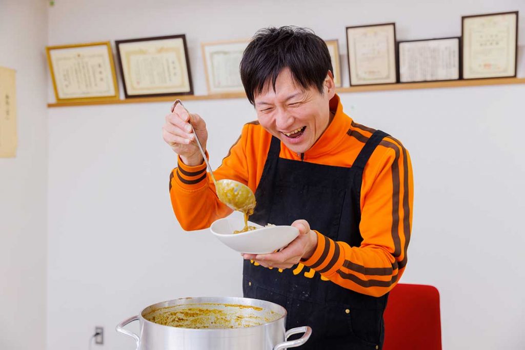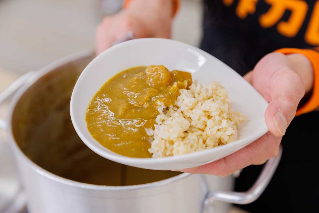 おもむろに寸胴を温めはじめた秀作さんの周囲には、おいしそうなカレーの香りが。どうしても玄米とカレーの相性を証明したかった秀作さん。「秀作カレー」を持参していたのです!