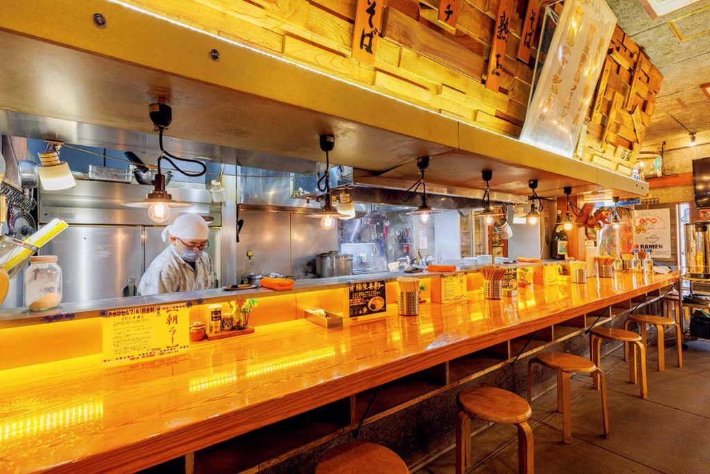 カウンターのみの小ぢんまりとしたお店。朝ラーメニューは特になく、どの時間帯もすべてのメニューが注文できます