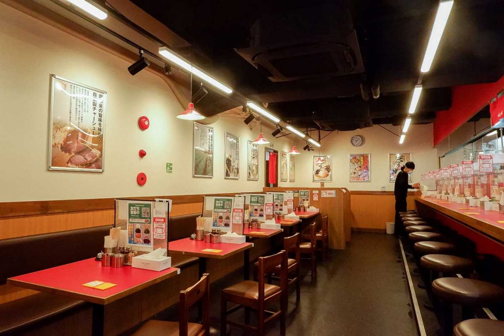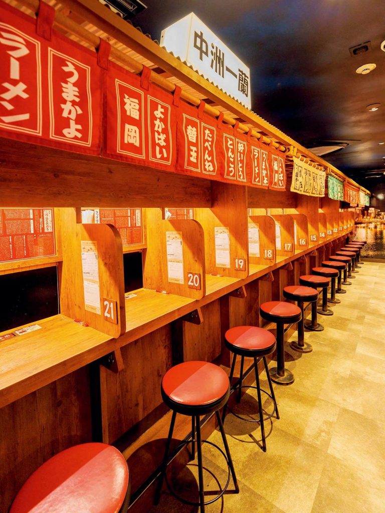 博多の屋台風の店内に、左右正面で仕切られた「味集中カウンター」がずらりと並びます。ほかのお客さんはもちろん、スタッフとの接触も最小限に抑えられていて、周囲を気にせずラーメンを楽しむことができそうです!