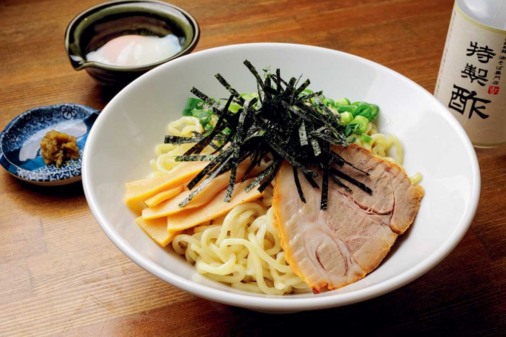 看板メニューの「油そば」(720円)。半熟玉子は1個まで無料!酸味少なめの自家製酢や辛味を押さえたラー油などでカスタマイズしよう