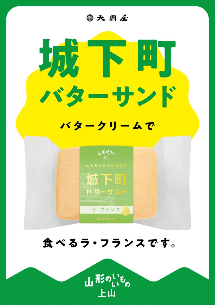 かみのやま温泉で手作りにこだわり、からだに優しいお菓子をつくる『大國屋』。バタークリームの層を厚めにし、大きめにカットしたラ・フランスは濃厚な風味で、果実な口あたり。特別に焼き上げたサブレ生地で豊かな味わいに仕上がりました。