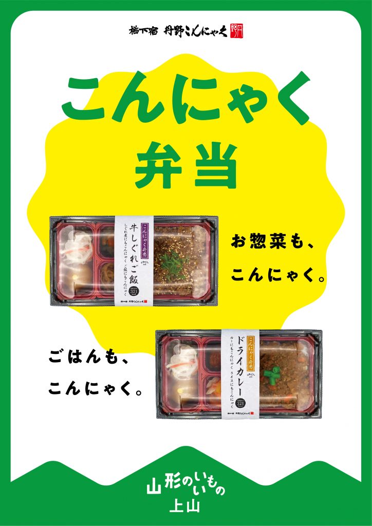 上山市で二代に渡りおいしいこんにゃく料理を手掛けてきた『丹野こんにゃく』。自慢の味をお弁当に詰め込んだこちらの新名物は「え!これもこんにゃく?」とびっくりも一緒に楽しめます。