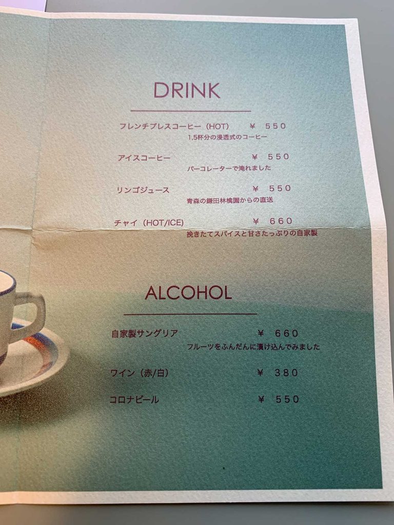 また、コーヒーやチャイなどのドリンク、自家製サングリアなどのアルコールもあります。