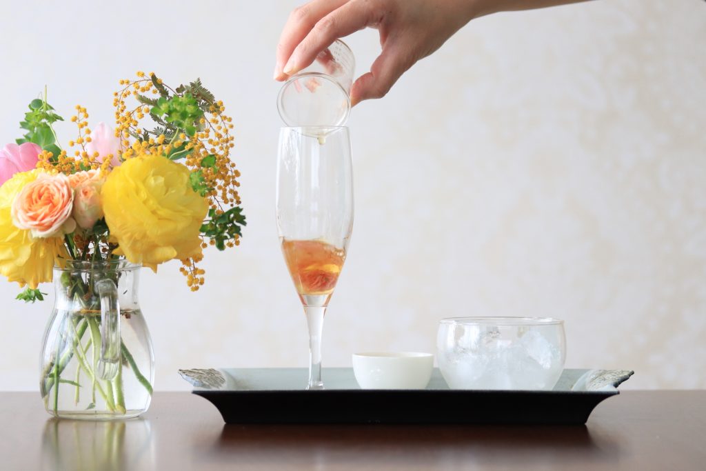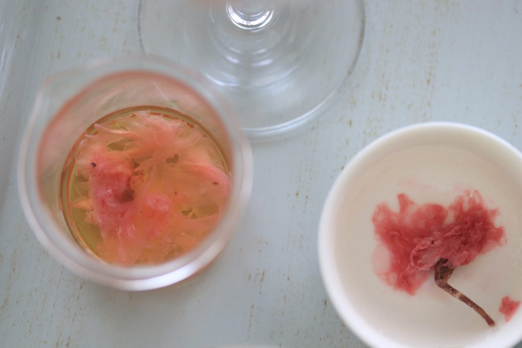 ・さくらは水につけておいて、塩をしっかりと抜く事前準備をしてください。塩抜きが完了したら、ティーシロップに漬け込んでくださいね。