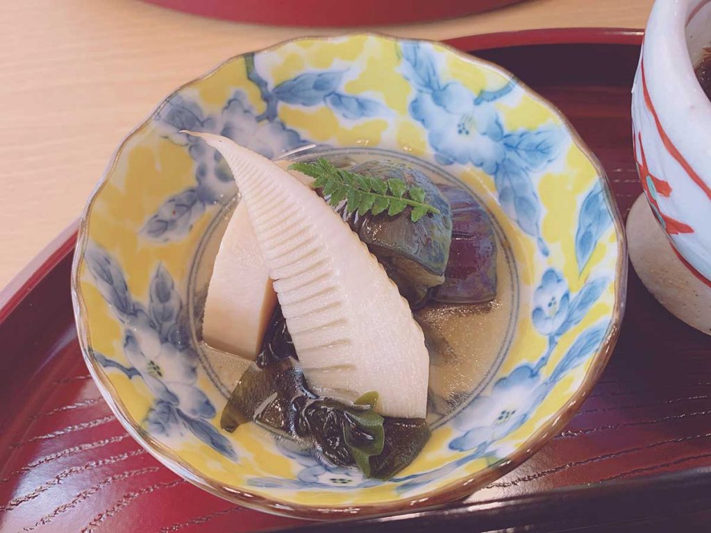 小鉢の一つ目はタケノコと茄子の炊き合わせ。歯触りの良いタケノコとワカメに旬を感じます