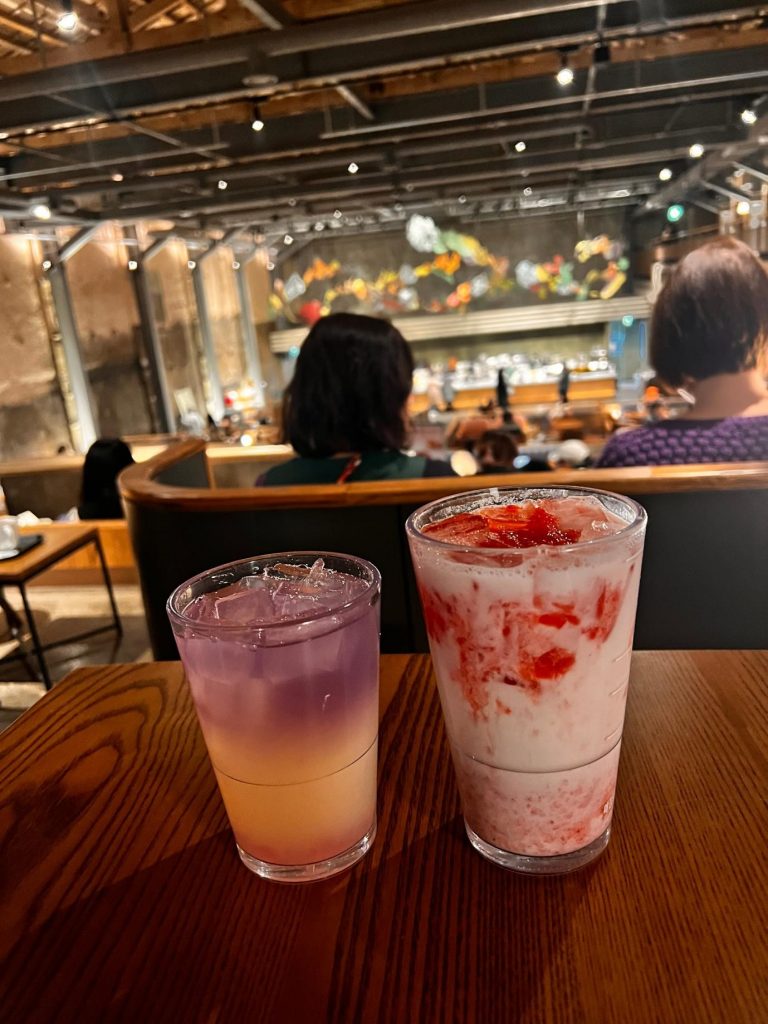 韓国限定メニュー左:「ライラックブロッサムティーT」(6,300ウォン)、右:「スプリングストロベリーミルク」(6,900ウォン)