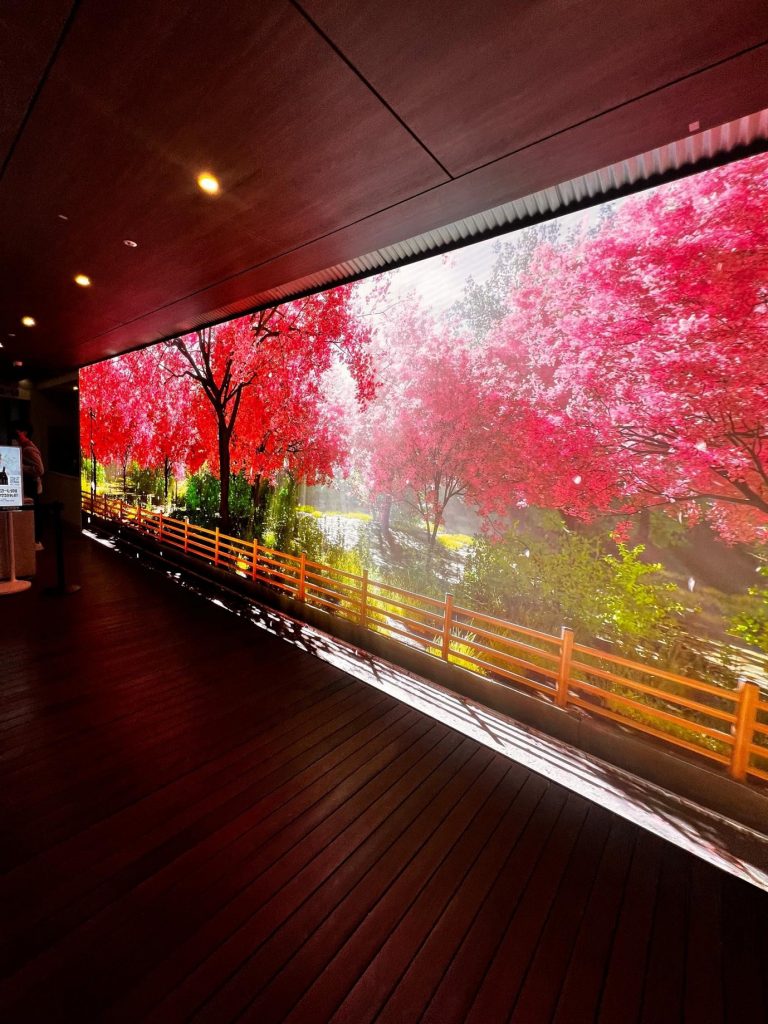 急にガラリと雰囲気が変わるドアをくぐり、階段を登るとそこは別世界🚪綺麗な桜の🌸*・映像が流れるフロアを抜けいよいよStarbucks店内へ。