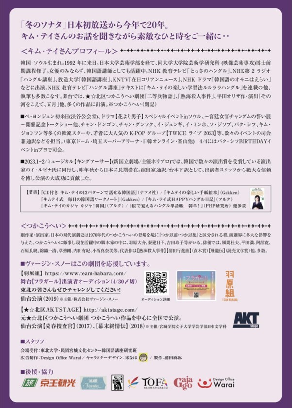 後援・協力:京王観光株式会社仙台支店/石巻名画座·シアターキネマティカ/石巻劇場芸術協会/大魔王グループ/東北日韓友好連合会TOFA/Gaja-Go!/Design Office Warai