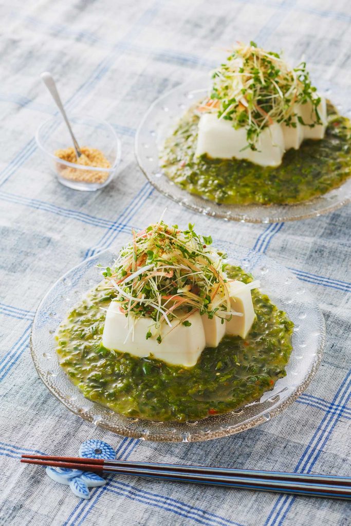❷器に豆腐をのせたら、周りに①を敷き、混ぜ合わせたAを盛り付けたらでき上がり。