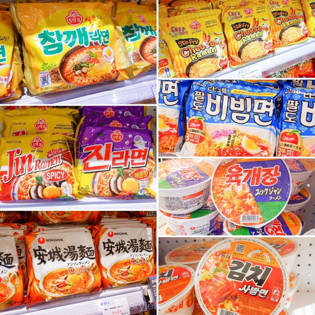 左上から「オットギ チャムケラーメン」「オットギ ジンラーメン」「農心 安城湯麺」。右上から「オットギ チーズラーメン」「ビビン麺」「農心 ユッケジャンラーメン」「農心 キムチラーメン」