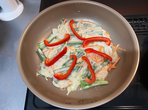 片面が焼けてひっくり返したらトッピング用のパプリカを乗せて押し付けるように焼いていきます。