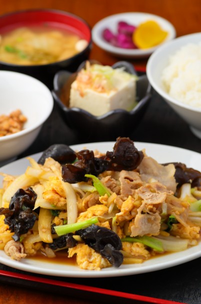 木くらげ玉子炒め、ご飯、味噌汁、納豆、冷奴、漬物付の「木くらげ玉子炒め定食」(800円)。※ご飯大盛+50円。主菜の大盛+100円