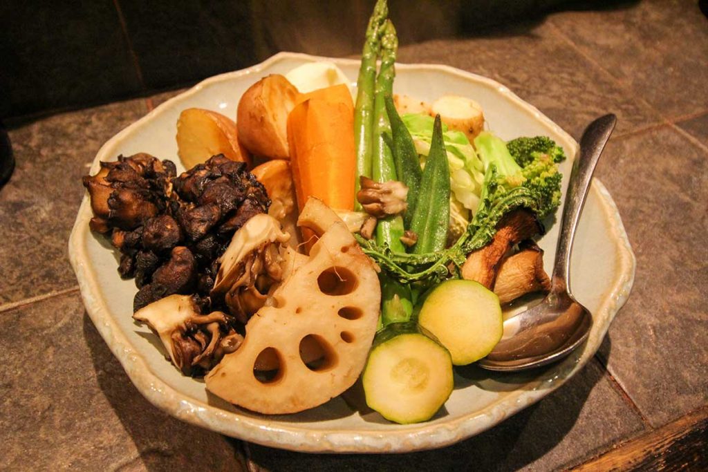 「温サラダ」(1,100円) レンコンやアスパラ、ジャガイモなどたくさんの野菜を醤油ベースのタレで焼いた、ふーみんお気に入りのひと皿