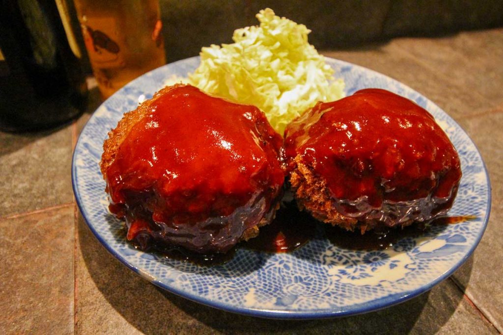 「特製メンチカツ」(2個1,000円) まんまる大きなメンチカツは、多くの人が頼む人気メニュー。瓶ビール(650円~)と相性抜群だ!