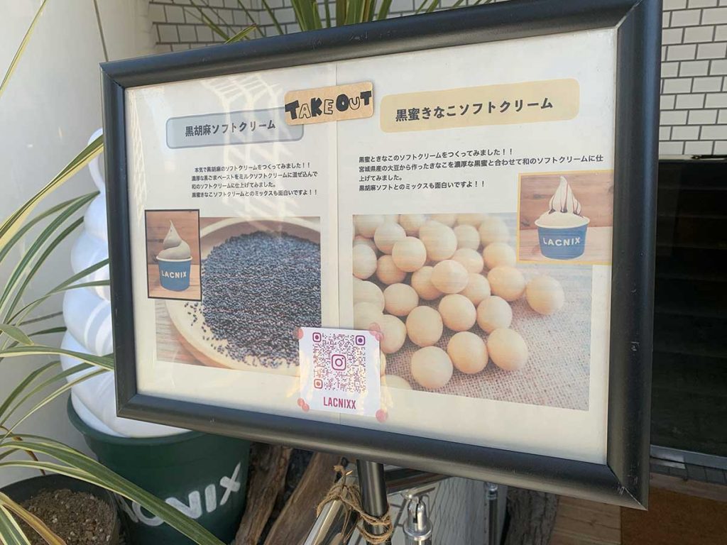 併設のソフトクリーム専門店『LACNIX』では、月替りで2種類の味がテイクアウトでき、ドリンクと一緒にオーダーすればイートインでも楽しめます。