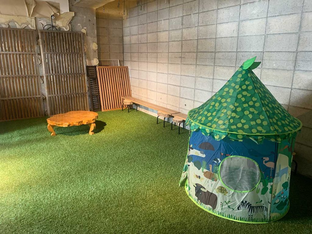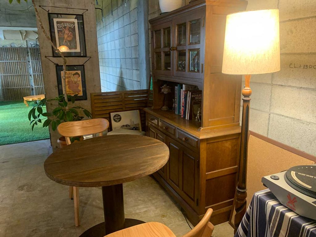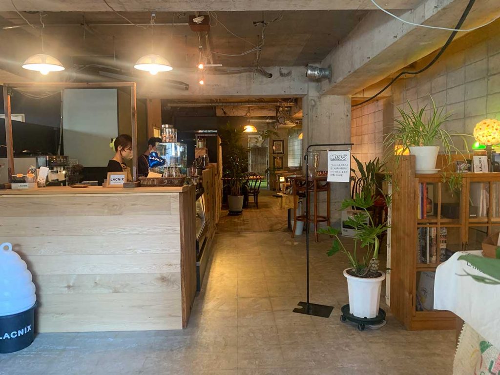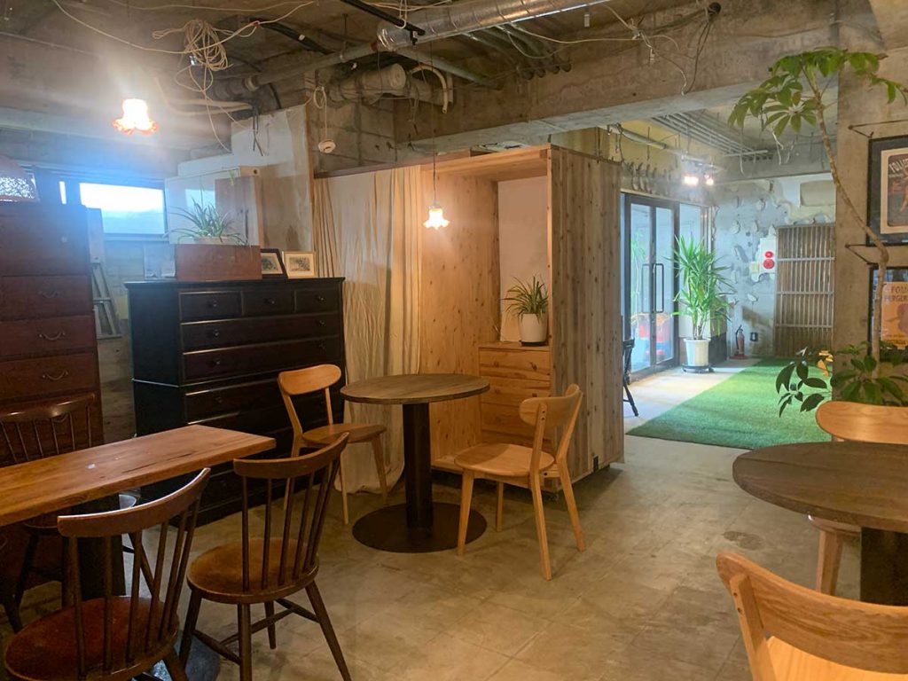 秘密基地のような入口の階段を降りると、想像以上に広々とした店内。半地下とは思えない、リゾートカフェのような非日常空間が出迎えてくれます。