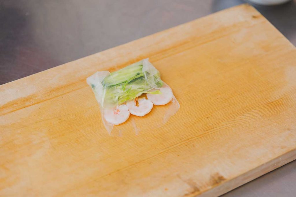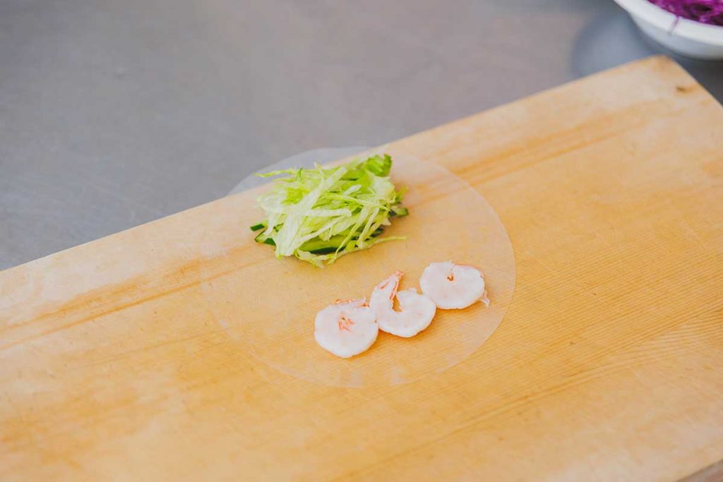 ❷水で濡らしたまな板の上に①を置き、野菜を手前、少し空けて海老とチキンを奥にのせる(※1)。※海老は赤い色が表に出るようにのせる。