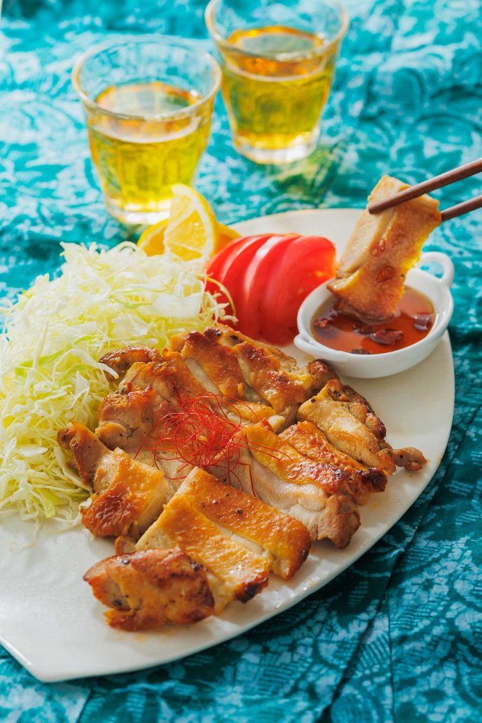 ❷鶏肉をひと口大にカットして盛り付け、つけダレBを添えたらでき上がり。