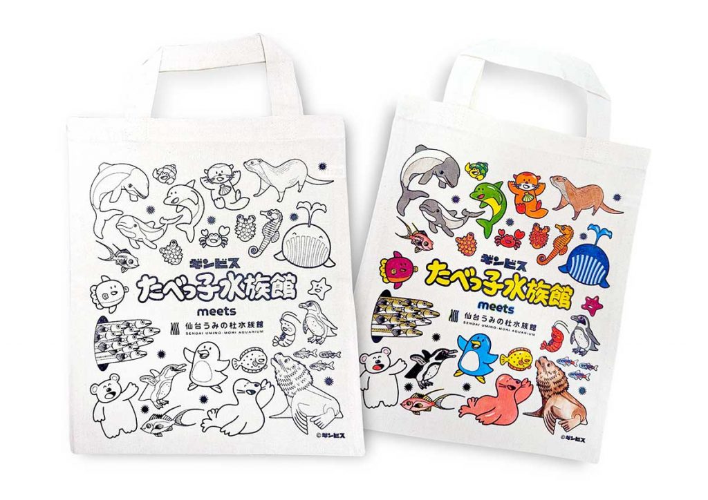 「たべっ子水族館」のオリジナルトートバッグが作れるワークショップは毎日開催。キャラクターがプリントされたA4サイズのトートバッグに専用のペンで色を塗って、自分だけのオリジナルトートバッグが作れる(1,200円)