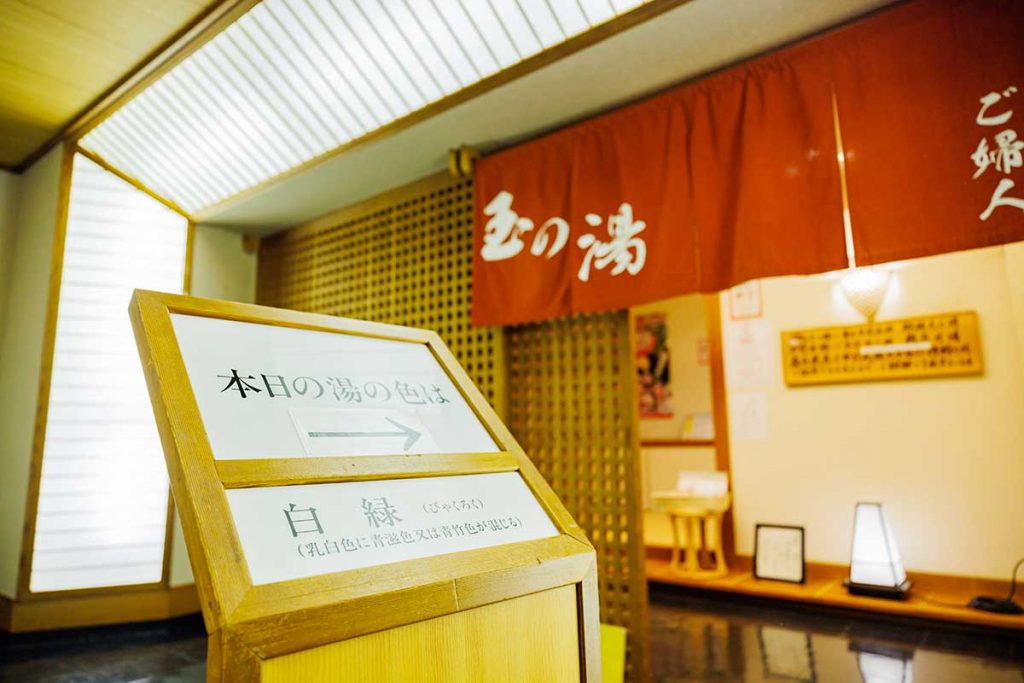大浴場の入り口には、現在の湯色を教えてくれるプレートが。白緑ってどんな色なんだろう!?ワクワク