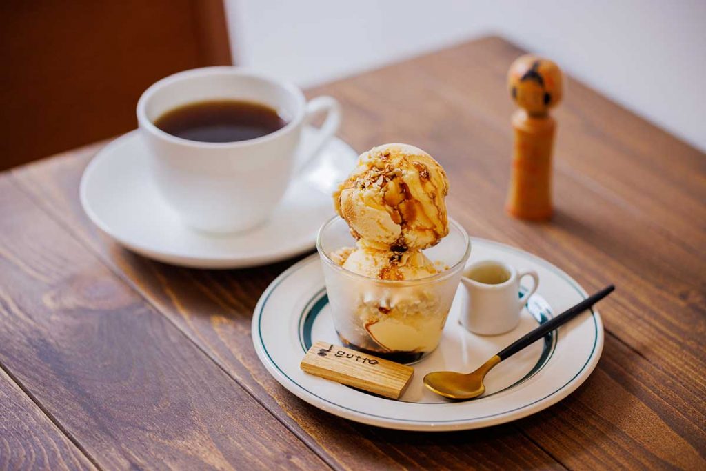 2023年5月30日にオープンしたばかり。レトロな温泉街で一番新しい『cafe gutto(カフェ グット)』で喫茶ブレイク。ご当地ブレンドを飲みながら、旅の余韻に浸ります。