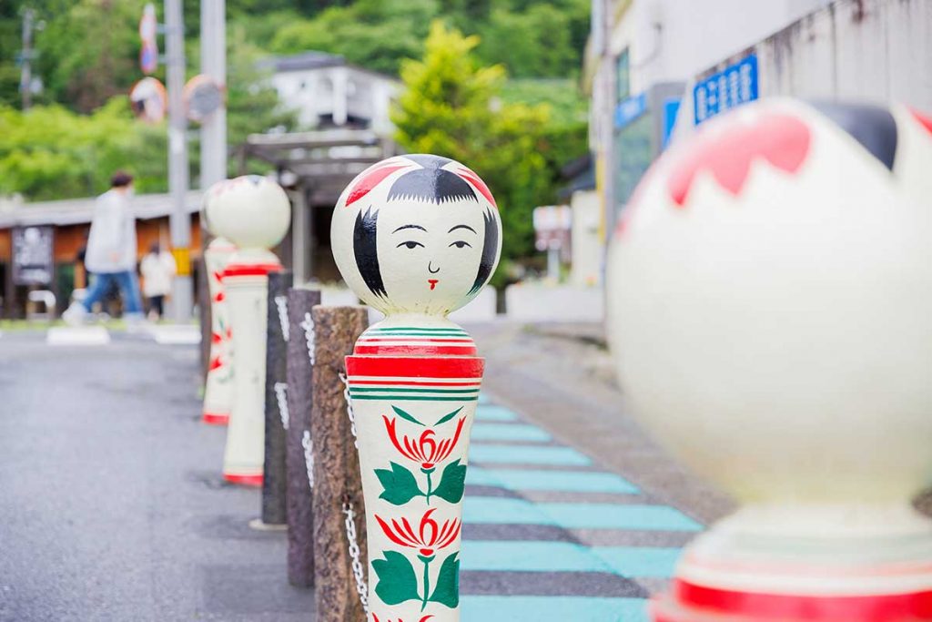 街を歩けば至るところに、こけしをモチーフにした看板やオブジェが。にこやかなお出迎えに心がゆるみます。