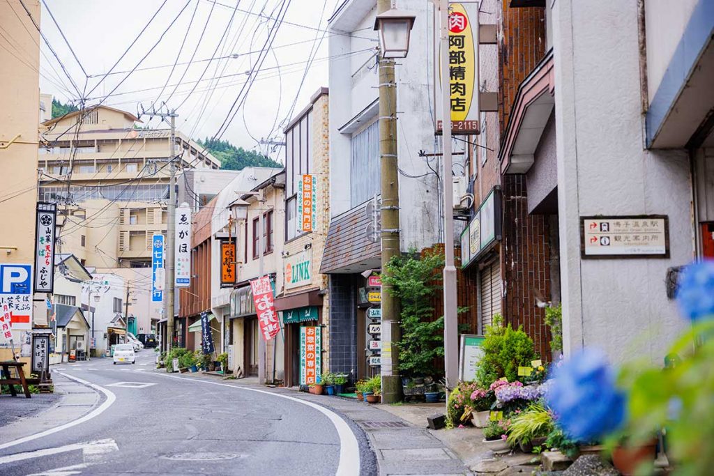 昔ながらの喫茶店や食堂、土産店が立ち並ぶ温泉街。昭和レトロな雰囲気でエモい