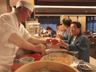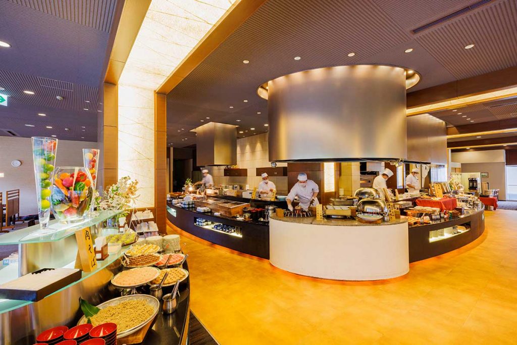 目の前で料理人が調理する、ライブ感あふれるバイキング。
