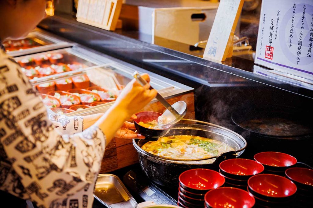 そうした縁から、鳴子温泉郷の宿や飲食店では、宮城野部屋直伝の「なる子ちゃんこ鍋」を提供しています。『鳴子ホテル』では、塩バター仕立てでアレンジ。鶏団子や野菜のうまみも溶け込んでいて、滋味深い味わいです。