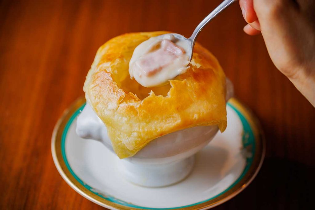 熱々サクサクのパイを崩すと、濃厚なホワイトソースの中にベーコン、しめじ、そして、ホタテがまるまる1個!お客さまからのリクエストが多く、2年前に復活したメニューだと聞きました。