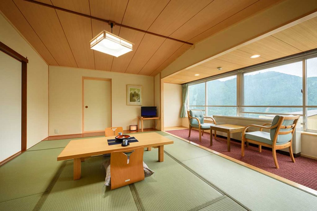 のどかな里山の風景に囲まれて、日常を忘れるリセット時間がスタート。和のしつらえが落ち着く客室で、肩の力もふうっと抜けていきます。