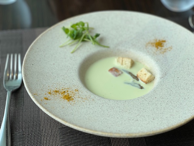 スープは「枝豆の冷製ヴィシソワーズ じゅんさいを添えて」。和食のイメージが強いじゅんさいが、こんなオシャレな冷製スープになるだなんて…!